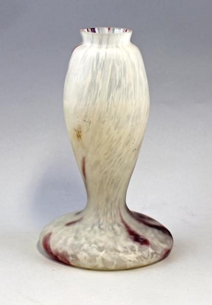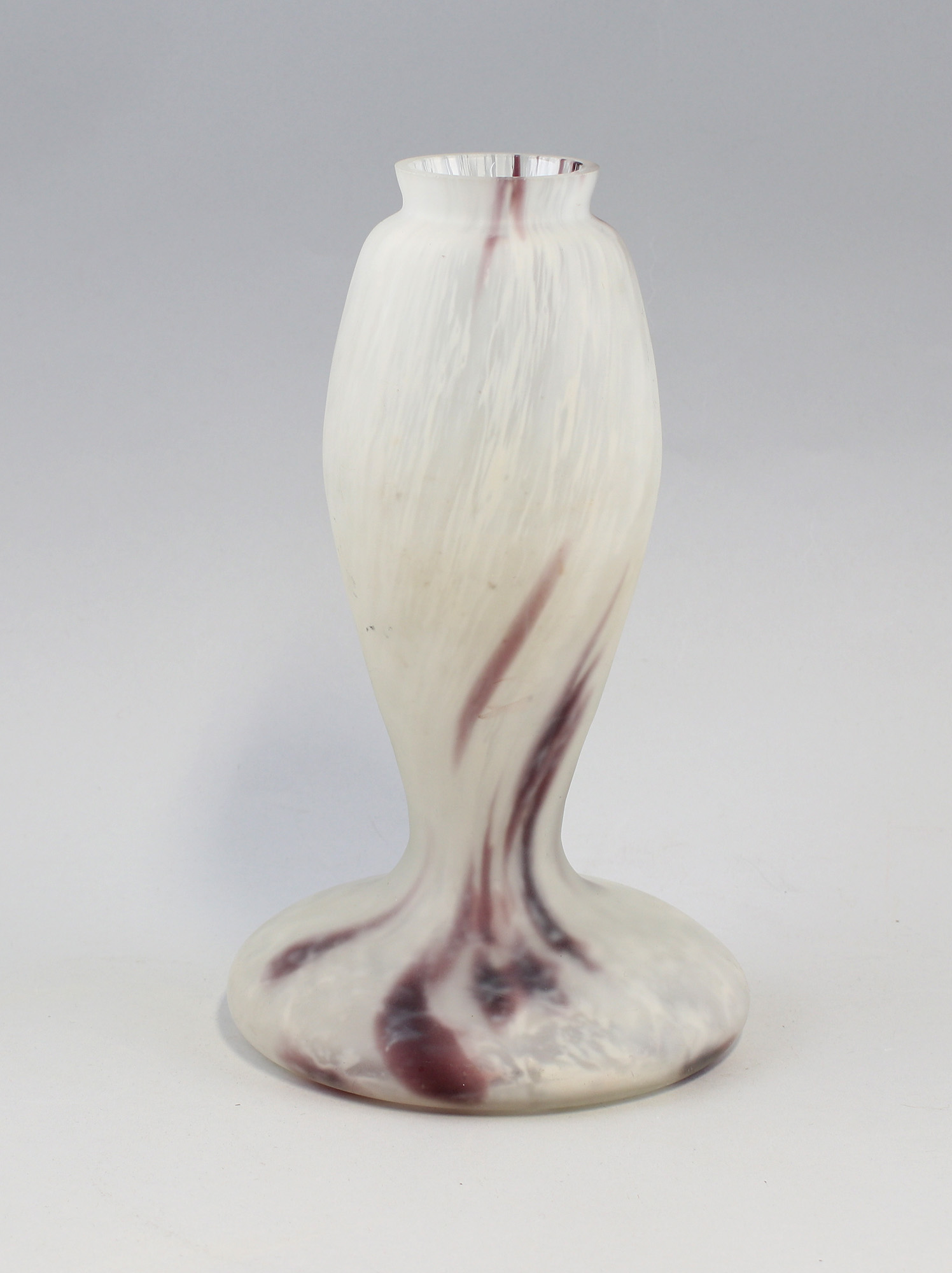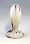 Pâte de verre-Technik, farbloses Glas mit weißen und violetten Glaspulvereinschmelzungen, formgeblasen, D Fuß 15 cm, D Mündung 4,7 cm, H 25,5 cm
