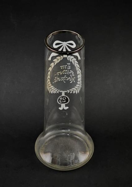 19.Jh., aus farblosem Glas, Wandung handbemalt mit Emailfarben, H 21,5cm, mit Aufschrift "Zur Silberhochzeit", Alters- und Gebrauchsspuren